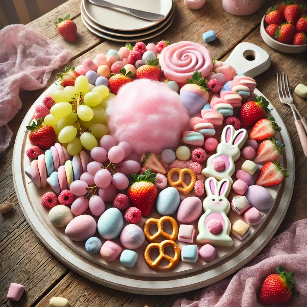 • Ingredients: Cotton candy grapes (yes, they taste like magic!), ripe strawberries, fresh raspberries, pastel chocolate eggs, marshmallow bunnies, and yogurt-dipped pretzels.