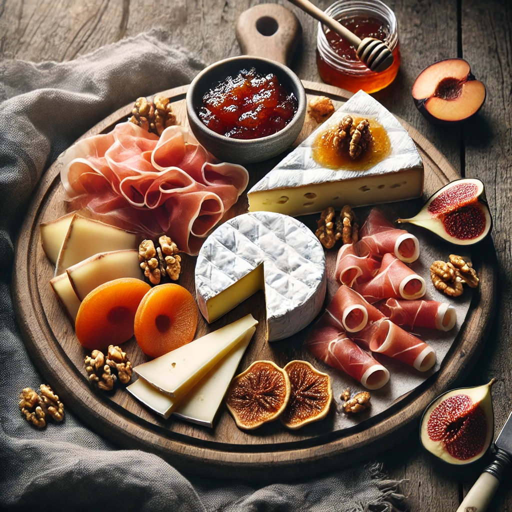 • Recipe: Arrange the cheeses and prosciutto in a visually appealing layout, place fig jam and honeyed walnuts in small bowls, and layer in dried apricots and pear slices for a mix of textures and flavors.