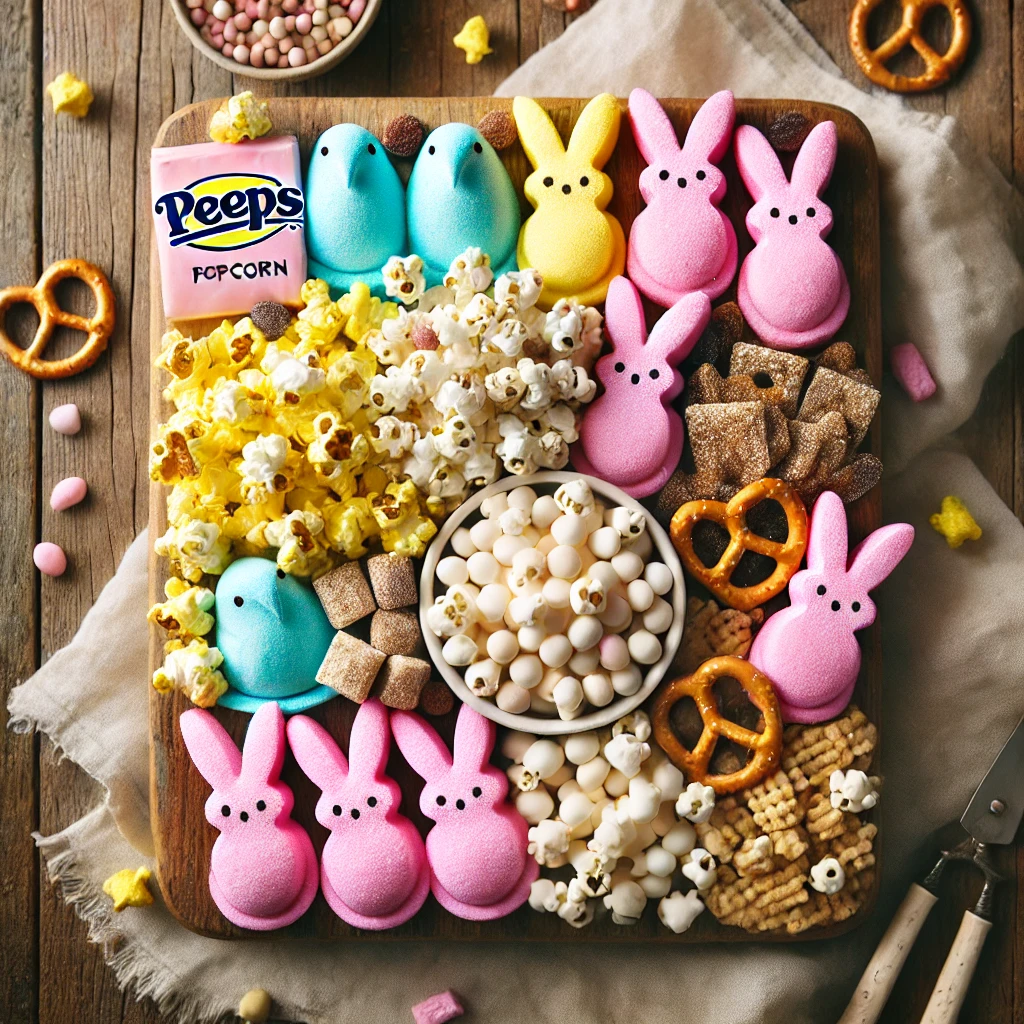 • Ingredients: Airy pastel popcorn, candy-coated Peeps, white chocolate chips, chewy dried fruit, and crispy pretzel rods.