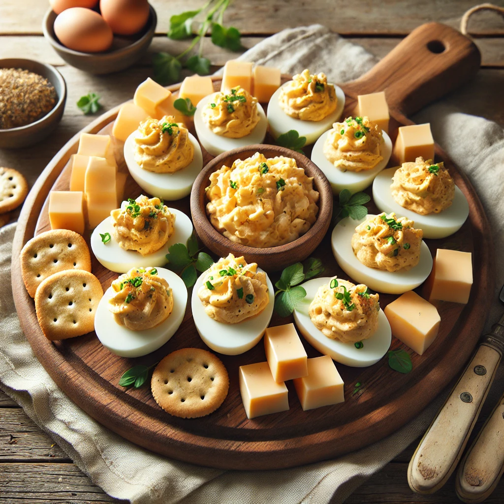 • Ingredients: Hard-boiled eggs, creamy mayo, tangy mustard, smoky paprika, bite-sized cheese cubes, crisp crackers, and fresh herbs.