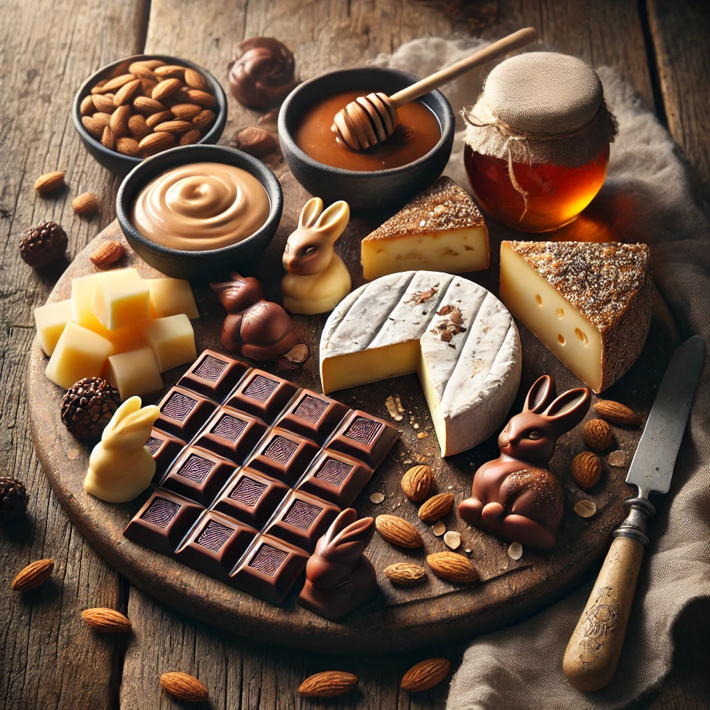 • Ingredients: Rich dark chocolate, velvety milk chocolate bunnies, creamy brie, smoky gouda, toasted almonds, and golden honey.