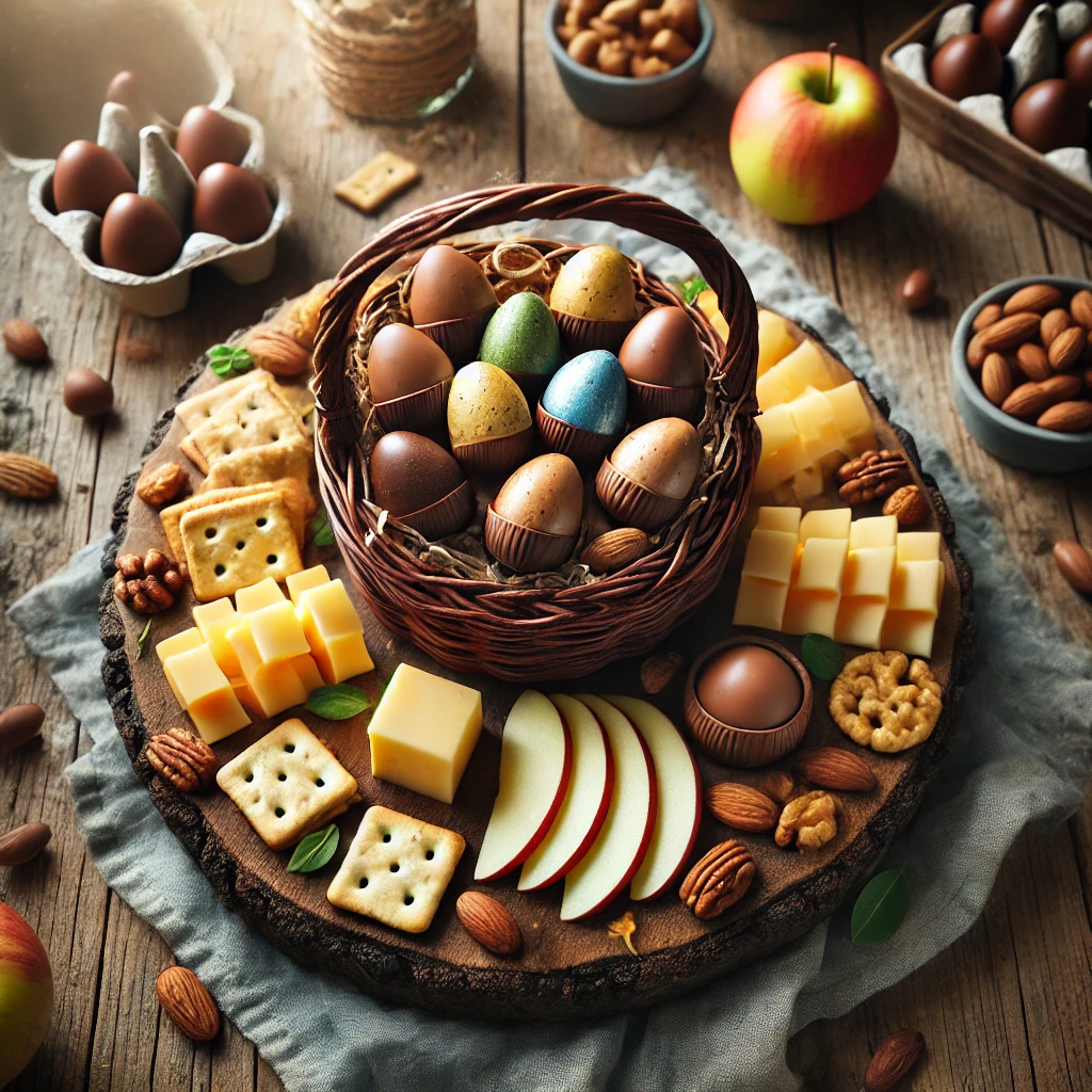 • Ingredients: Shiny chocolate eggs, bold cheddar cubes, flaky crackers, crisp apple slices, and a mix of nuts.
