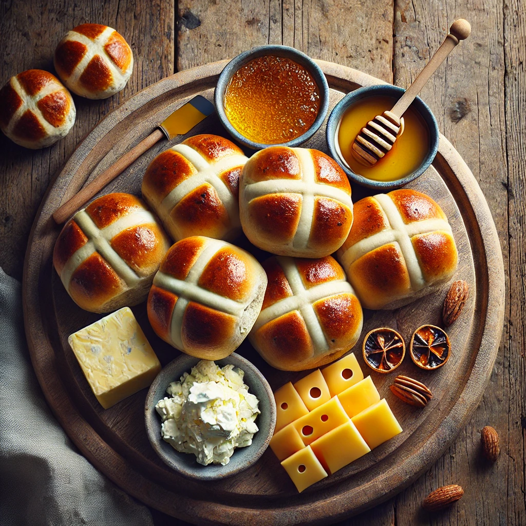 • Ingredients: Freshly baked hot cross buns, aged cheddar, buttery brie, whipped butter, and golden honey.
