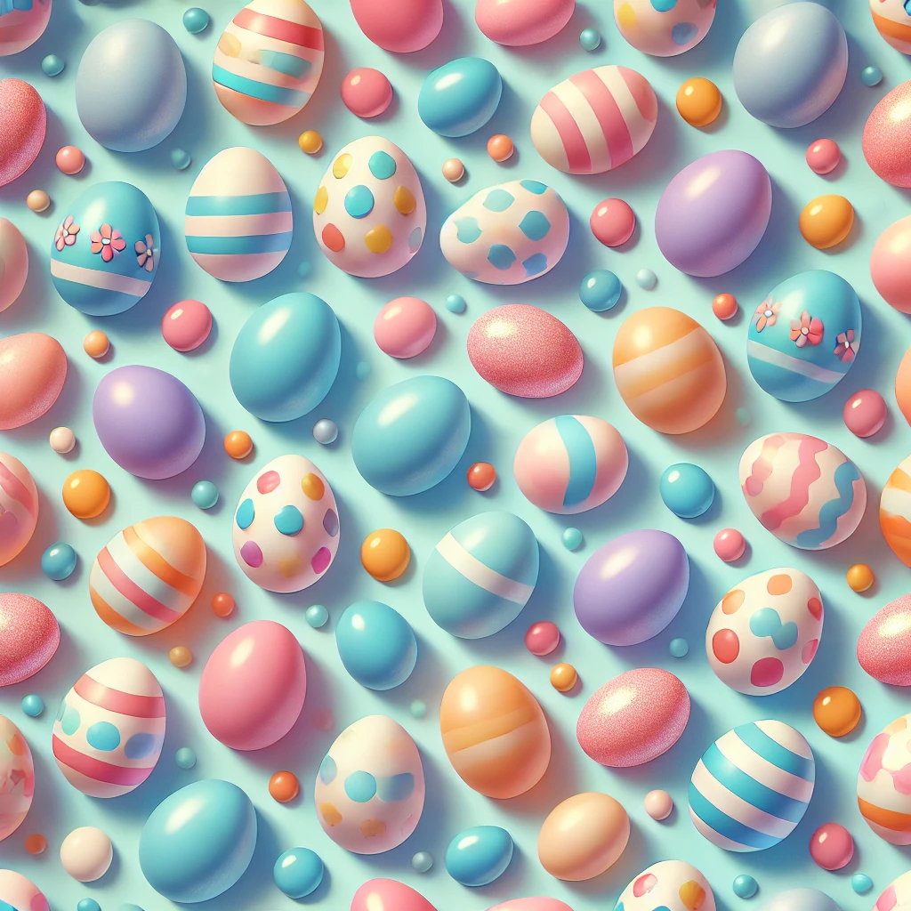 Candy-colored eggs on a baby blue or lavender background — sweet and eye-catching.