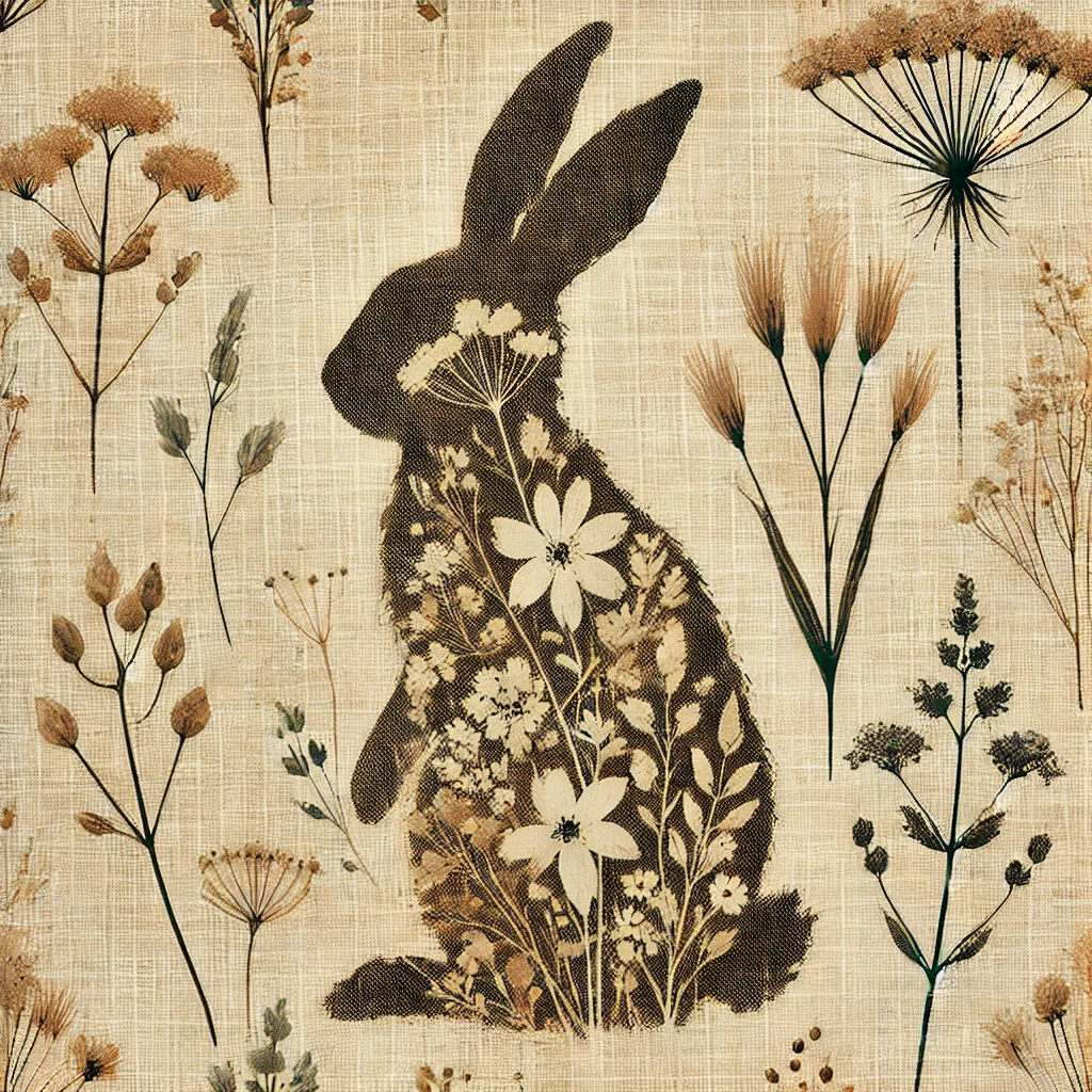 A silhouette of a bunny filled with wildflowers on a linen texture. Soft, textured, and natural.