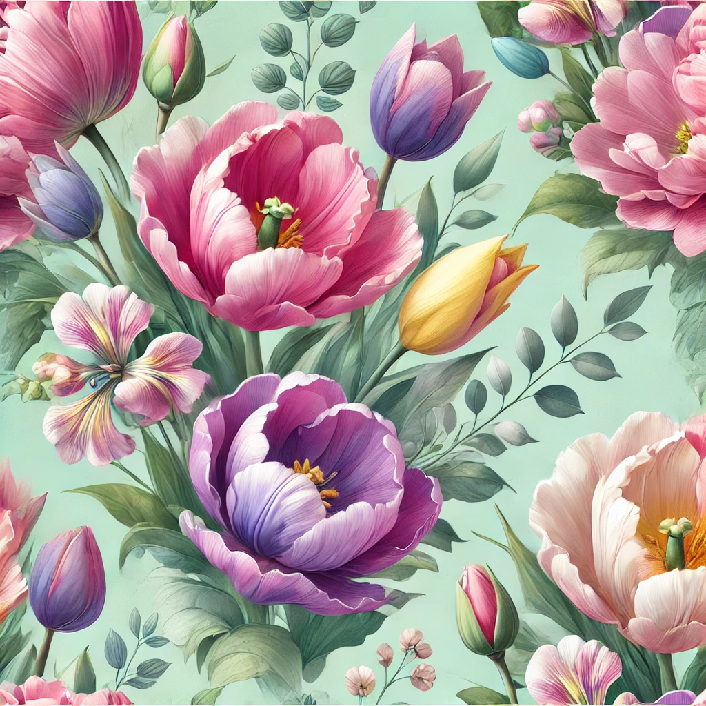 Large-scale watercolor tulips across a soft mint or blush background. So fresh, so floral.