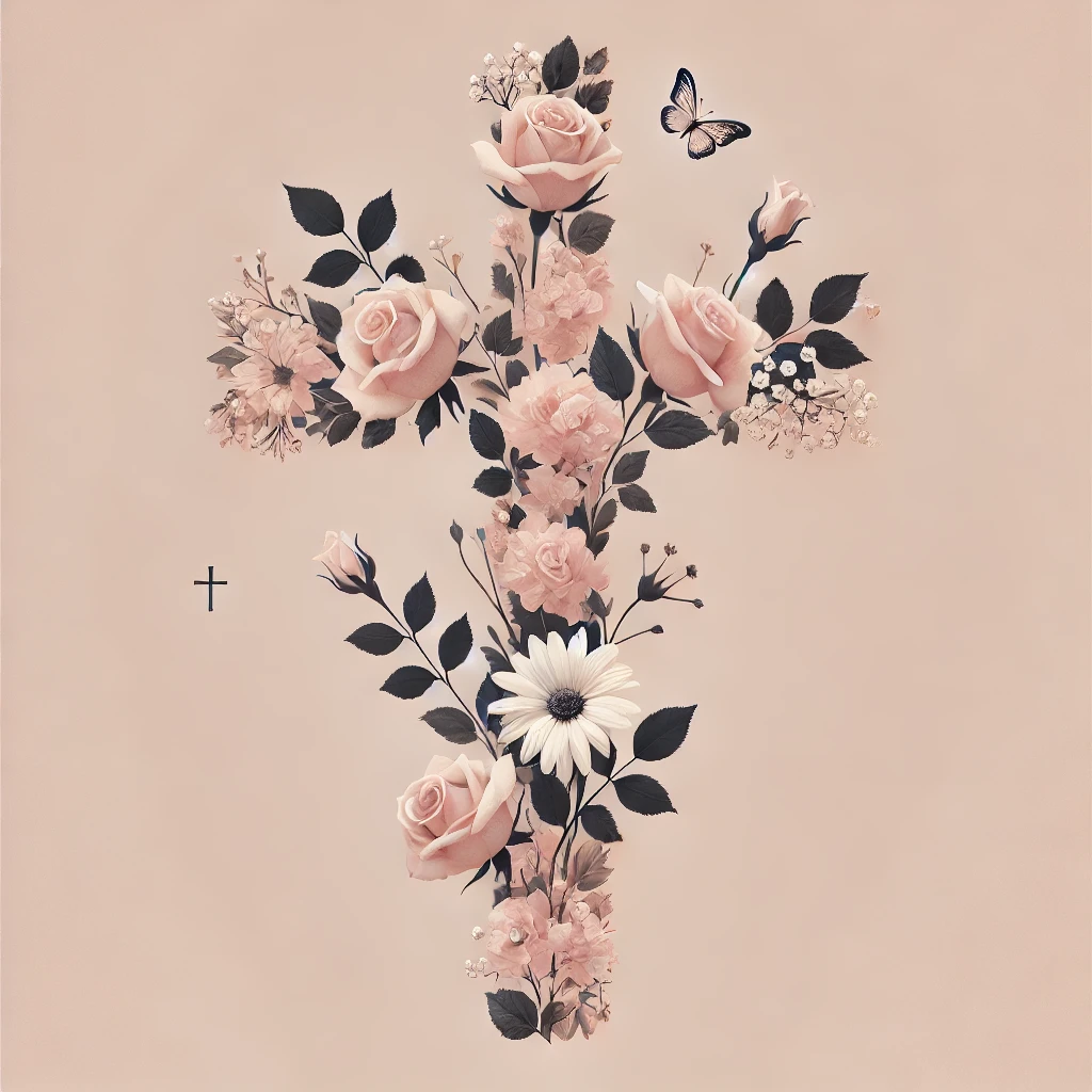 A subtle cross made entirely of spring flowers on a soft pastel background. Elegant and meaningful.